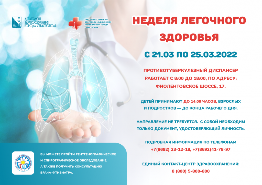 Именно потому в преддверии Всемирного дня борьбы с туберкулёзом медики Севастополя запустили акцию «Неделя лёгочного здоровья». Основная цель – проинформировать население о профилактике и лечении этого инфекционного заболевания.