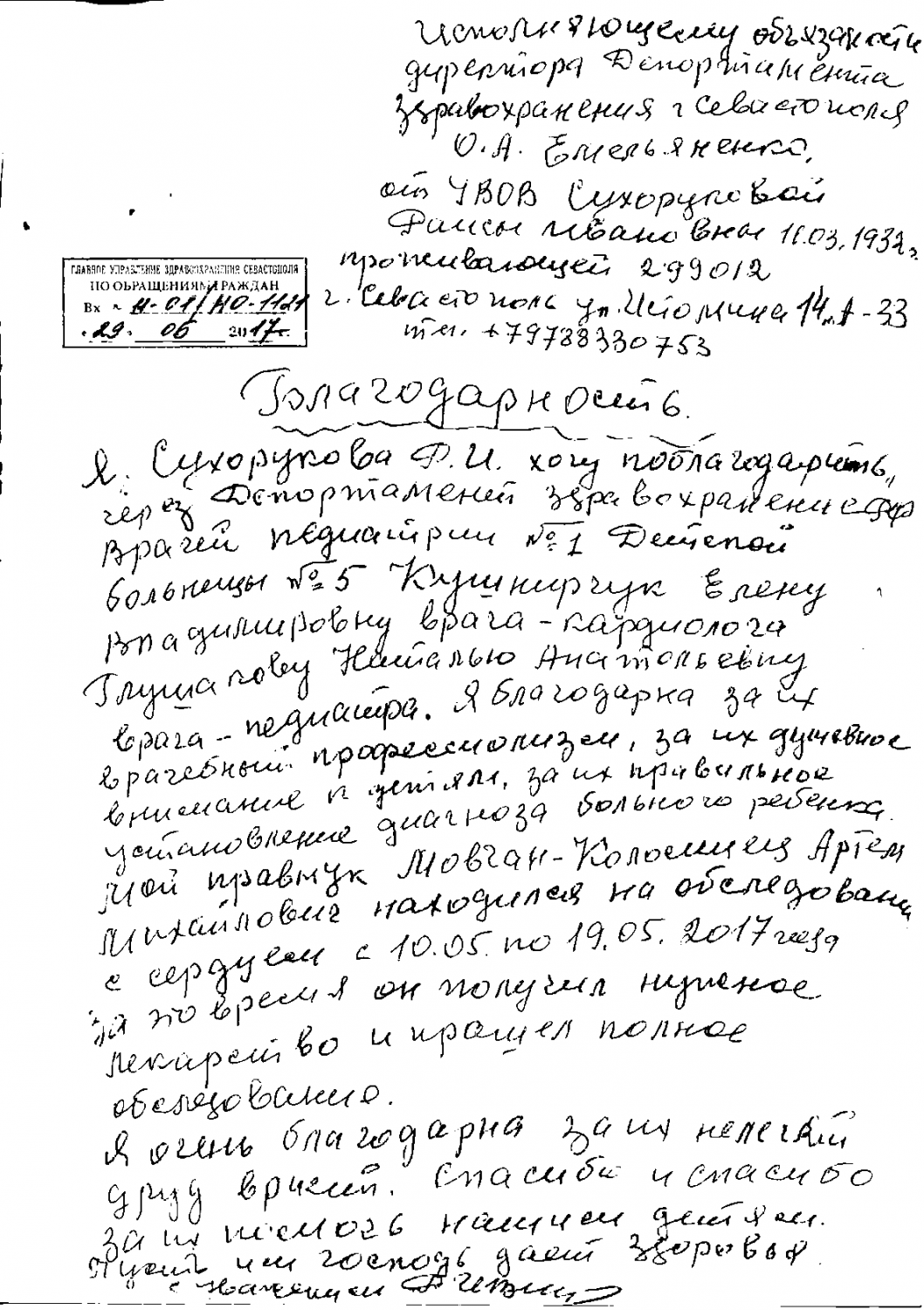 В Департамент здравоохранения Севастополя поступила благодарность от жительницы города Раисы Сухоруковой о работе врачей педиатрического отделения №1 ГБУЗС "Городская больница №5 - Центр охраны здоровья матери и ребенка".