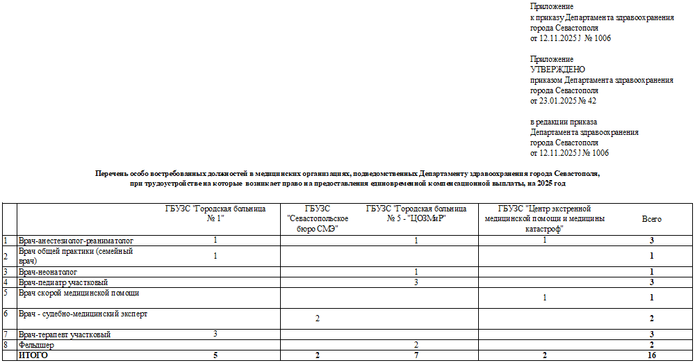 Перечень распределения должностей по программе предоставления единовременной компенсационной выплаты на 2025 год между медицинскими организациями, подведомственными Департаменту здравоохранения города Севастополя: