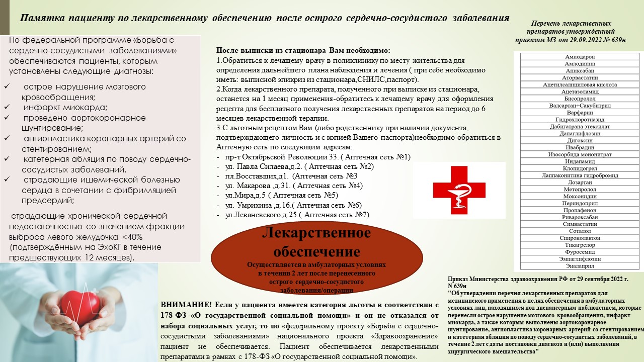 Обеспечение лекарственными препаратами осуществляется в амбулаторных условиях в течении 2 лет после перенесенного острого сердечно-сосудистого заболевания/операции/