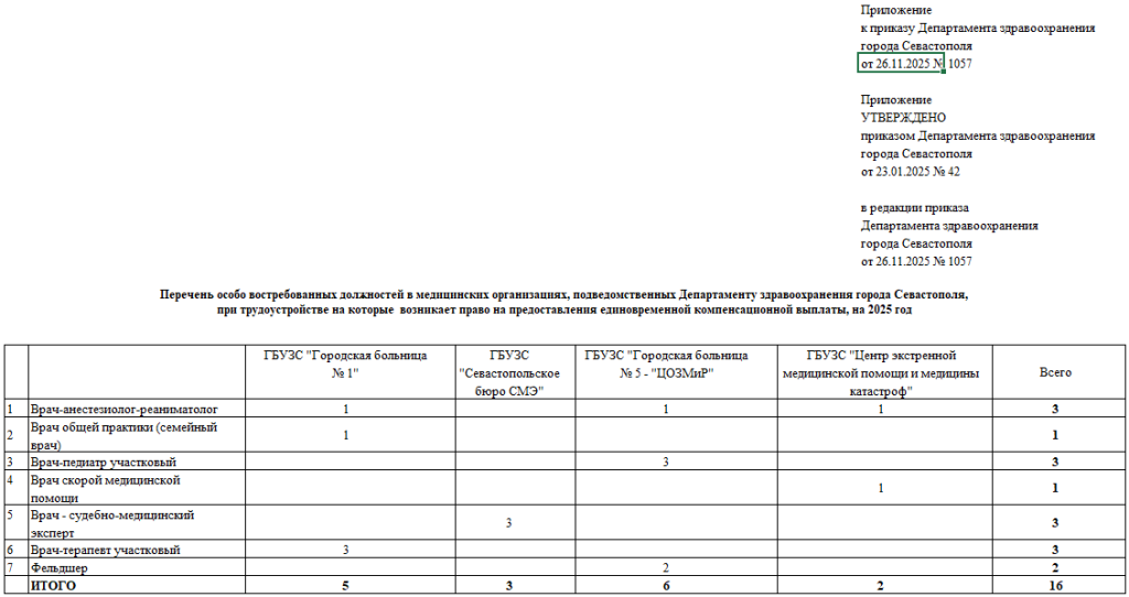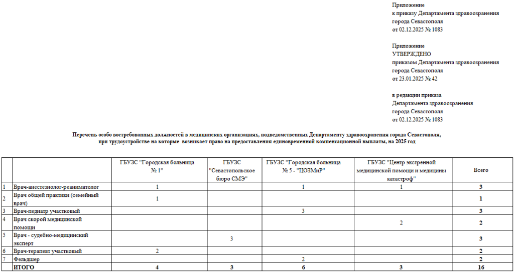 Перечень распределения должностей по программе предоставления единовременной компенсационной выплаты на 2025 год между медицинскими организациями, подведомственными Департаменту здравоохранения города Севастополя:
